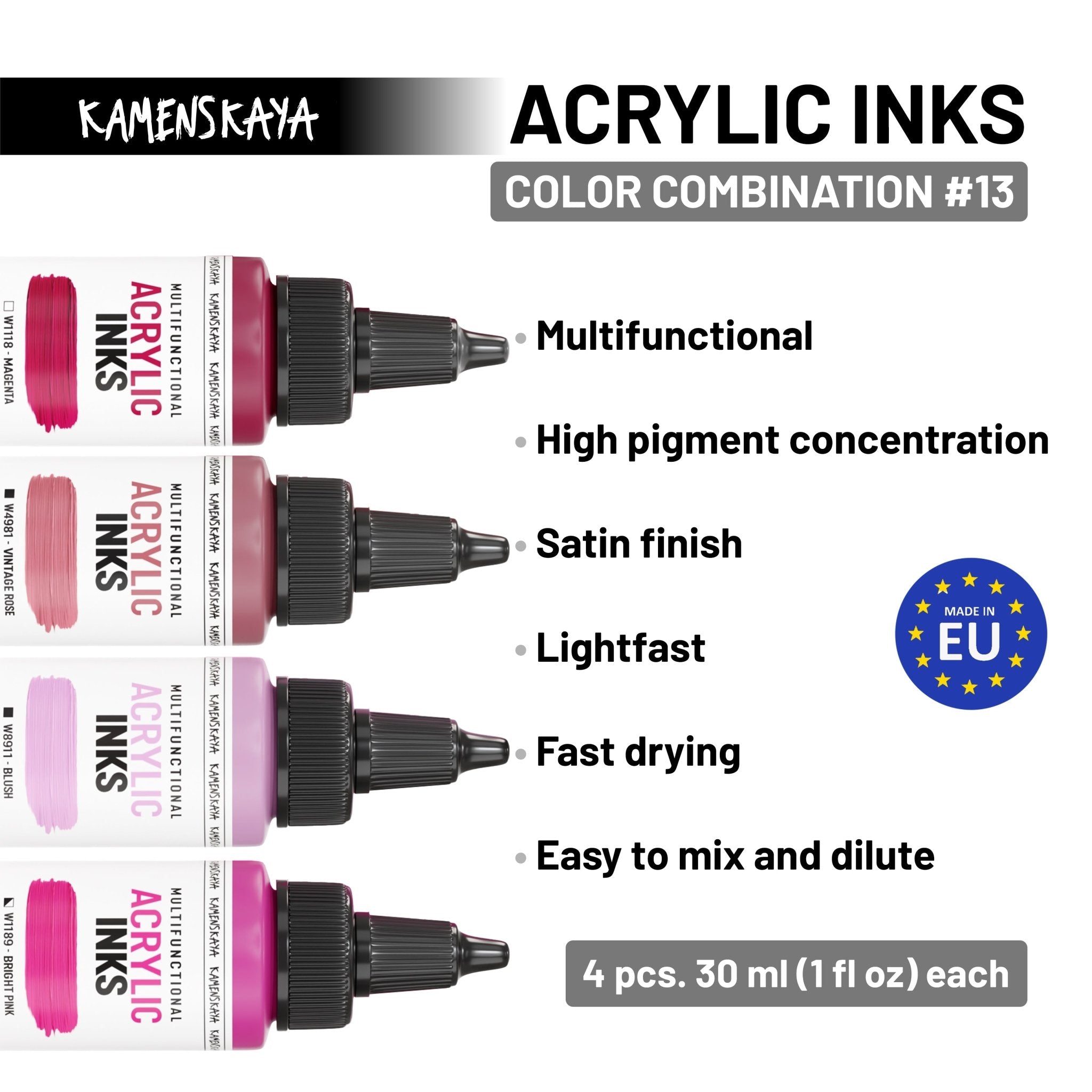 This set includes 4 full-size 30 ml / 1 fl oz multifunctional acrylic inks (liquid acrylic paint) selected to work beautifully together for smooth layering, bold accents, and balanced color harmony. The formula is super concentrated and slightly thicker for easier control, and you can change the consistency depending on the medium you use - from very fluid to paint-like - or dilute with water for washes.