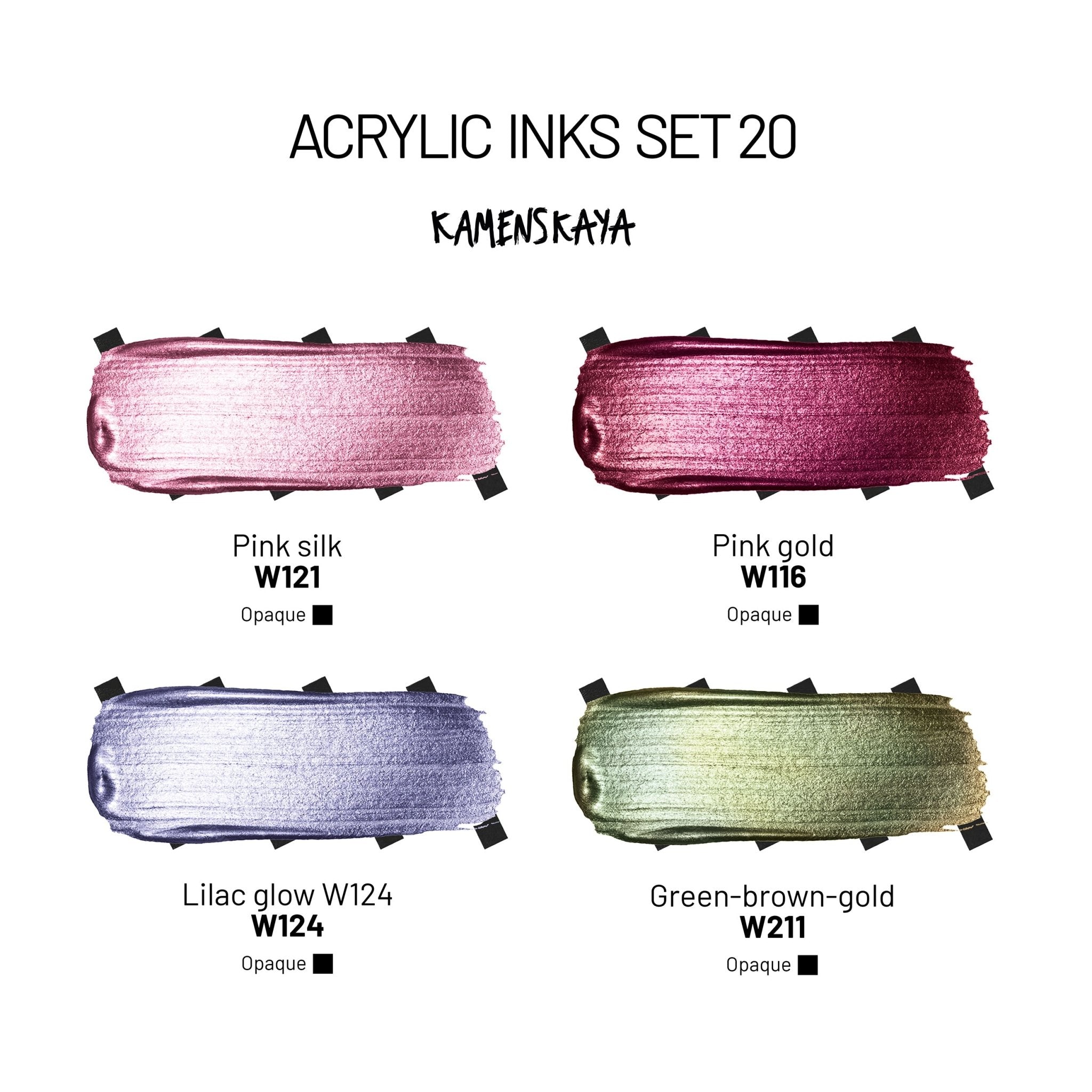 This set includes 4 full-size 30 ml / 1 fl oz multifunctional metallic acrylic inks (liquid acrylic paint) selected to work beautifully together for smooth layering, bold accents, and balanced color harmony. The formula is super concentrated and slightly thicker for easier control, and you can change the consistency depending on the medium you use - from very fluid to paint-like - or dilute with water for washes.